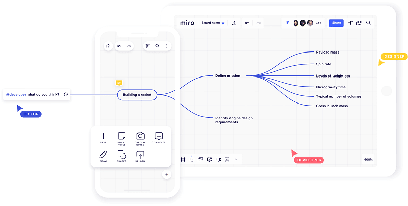Miro – היא לוח אינטראקטיבי שפשוט מאפשר לנו המון. מירו היא התשובה הדיגיטלית לסדנאות מעולמות הDesign thinking – מי שאוהב לעבוד עם פתקיות דביקות, תרשימים, מטריצות ותהליכי פיתוח אני בטוח שתמצאו את מבוקשכם. במירו תוכלו לעצב ולעבוד על מטריצות, לייצר תהליכי חשיבה ואפילו תוכלו למצוא תבניות מוכנות לכלים גינרים ונפוצים. במירו תוכלו לעבוד באופן משותף, בו זמנית- מאפשר מעורבות של כלל המשתתפים בתהליך.